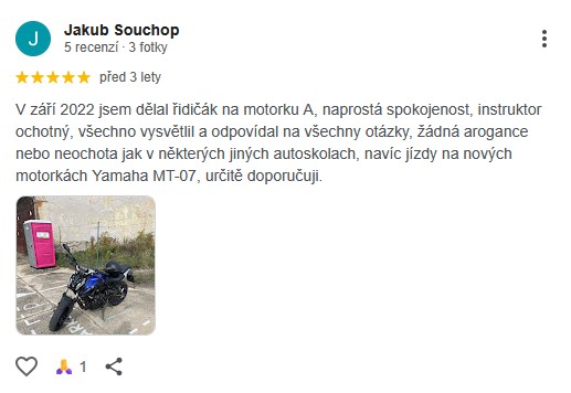 V září 2022 jsem dělal řidičák na motorku A, naprostá spokojenost, instruktor ochotný, všechno vysvětlil a odpovídal na všechny otázky, žádná arogance nebo neochota jak v některých jiných autoskolach, navíc jízdy na nových motorkách Yamaha MT-07, určitě doporučuji.