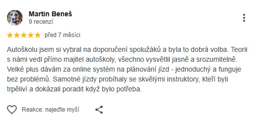 Autoškolu jsem si vybral na doporučení spolužáků a byla to dobrá volba. Teorii s námi vedl přímo majitel autoškoly, všechno vysvětlil jasně a srozumitelně. Velké plus dávám za online systém na plánování jízd - jednoduchý a funguje bez problémů. Samotné jízdy probíhaly se skvělými instruktory, kteří byli trpěliví a dokázali poradit když bylo potřeba.