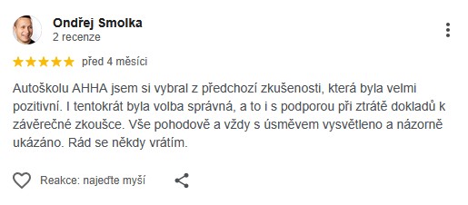 Autoškolu AHHA jsem si vybral z předchozí zkušenosti, která byla velmi pozitivní. I tentokrát byla volba správná, a to i s podporou při ztrátě dokladů k závěrečné zkoušce. Vše pohodově a vždy s úsměvem vysvětleno a názorně ukázáno. Rád se někdy vrátím.